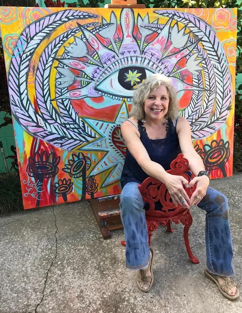 Modern Folk Artist, Judie Lee works in a myriad of mediums such as acrylic, recycled mixed media, block printing and metal sculpture. Harmonious riffs of color infused into multiple layers pay tribute to Florida's natural habitat and bright colors. She likes to create large bodies of work such as; Knockers and Daisies, The Keepers and the Wine Cellar. Judie grew up in Seven Mile, Ohio and lived in the Pacific Northwest for 25 years. In 2011 she moved to Florida to be near her family and now resides in beautiful Mt. Dora, Florida.
